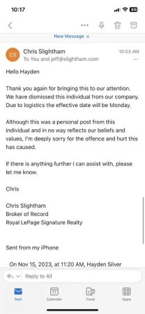 Hassan Nouman, a Sales Rep at Royal LePage, posted comments on Instagram claiming that the milk carton at Yonge and Eglinton depicting the hostages in Gaza is propaganda, and that "Jewish American pedophiles go to Israel for safety.” These posts were brought to the attention of the brokerage and that relationship was immediately terminated . . . for flagrant Jew hatred, not for pro-Palestinian advocacy.