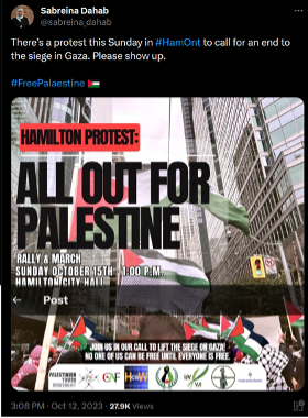 Back on October 13, we wrote to the prior chair, Ms Dawn Danko, about Trustee Sabreina Dahab's public association with a Holocaust denial gang calling itself "Toronto4Palestine". Last week we learned that the Hamilton Wentworth District School Board has done precisely nothing about it. See image below from Toronto4Palestine, an organization which Ms. Dahab promoted on social media, and another from Hamilton which she posted in October.